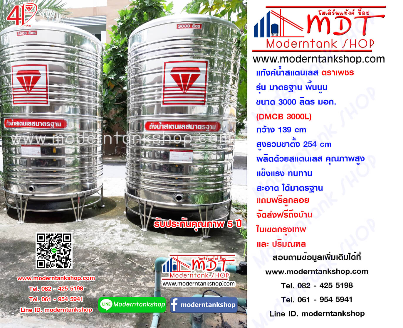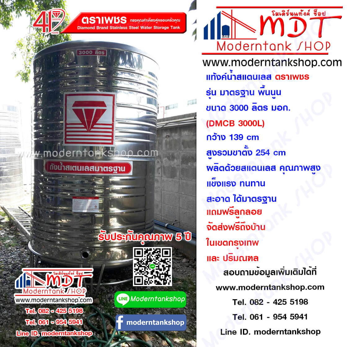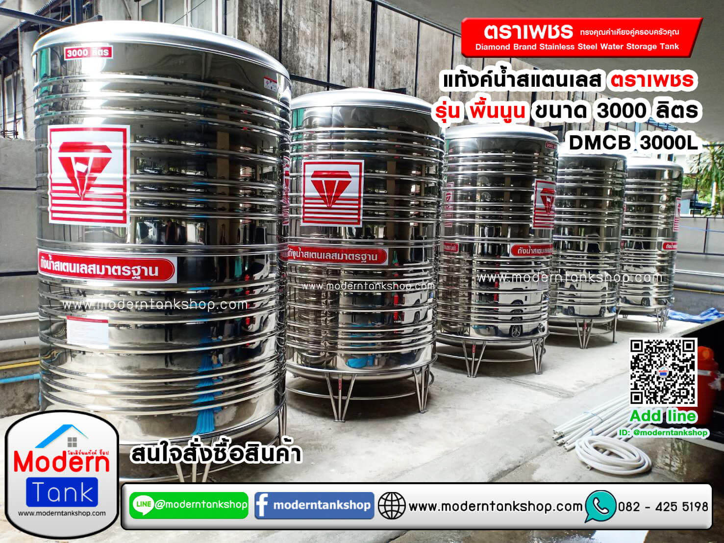 มีหลายขนาดให้เลือกตามความต้องการ แท้งค์น้ำสแตนเลส ตราเพชร รุ่นมาตรฐาน (รุ่นพื้นนูน ทรงอ้วน) รหัส DMCB DMCB 350L ขนาด 350 ลิตร กว้าง 0.59 x สูง 1.71 ม. ท่อเข้า 3/4 ออก 1" DMCB 500L ขนาด 500 ลิตร กว้าง 0.73 x สูง 1.74 ม. ท่อเข้า 3/4 ออก 1" DMCB 750L ขนาด 750 ลิตร กว้าง 0.91 x สูง 1.76 ม. ท่อเข้า 3/4 ออก 1" DMCB 1000L ขนาด 1000 ลิตร กว้าง 1.11 x สูง 1.56 ม. ท่อเข้า 3/4 ออก 1" (รุ่นขายดี) DMCB 1250L ขนาด 1250 ลิตร กว้าง 1.11 x สูง 1.79 ม. ท่อเข้า 3/4 ออก 1" (รุ่นขายดี) DMCB 1500L ขนาด 1500 ลิตร กว้าง 1.39 x สูง 1.57 ม. ท่อเข้า 3/4 ออก 1" (รุ่นขายดี) DMCB 2000L ขนาด 2000 ลิตร กว้าง 1.39 x สูง 1.80 ม. ท่อเข้า 3/4 ออก 1" (รุ่นขายดี) DMCB 2500L ขนาด 2500 ลิตร กว้าง 1.39 x สูง 2.18 ม. ท่อเข้า 3/4 ออก 2" DMCB 3000L ขนาด 3000 ลิตร กว้าง 1.39 x สูง 2.54 ม. ท่อเข้า 3/4 ออก 2" (สั่งผลิต) DMCB 4000L ขนาด 4000 ลิตร กว้าง 1.53 x สูง 2.99 ม. ท่อเข้า 3/4 ออก 2" (สั่งผลิต) DMCB 5000L ขนาด 5000 ลิตร กว้าง 1.53 x สูง 3.52 ม. ท่อเข้า 3/4 ออก 2" (สั่งผลิต) DMCB 6000L ขนาด 6000 ลิตร กว้าง 1.53 x สูง 4.15 ม. ท่อเข้า 3/4 ออก 2" (สั่งผลิต) DMCB 10000L ขนาด 10000 ลิตร กว้าง 2.23 x สูง 3.80 ม. ท่อเข้า 3/4 ออก 3" (สั่งผลิต) DMCB 15000L ขนาด 15000 ลิตร กว้าง 2.23 x สูง 4.81 ม. ท่อเข้า 3/4 ออก 3" (สั่งผลิต)