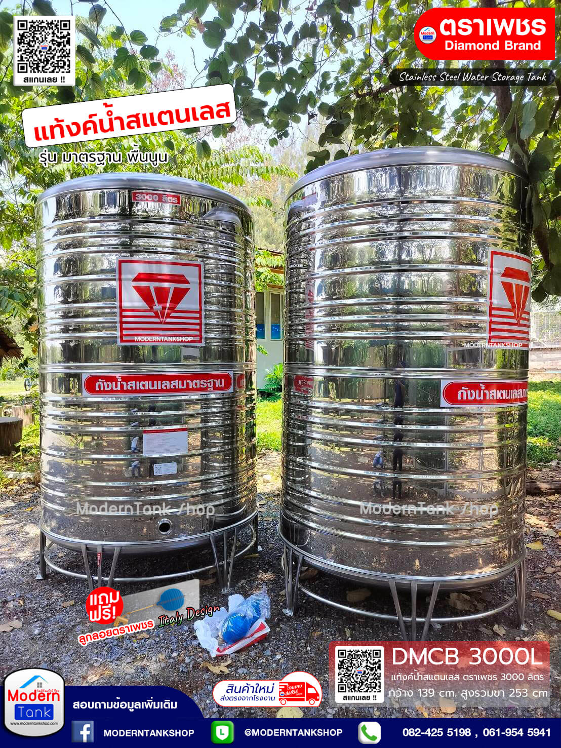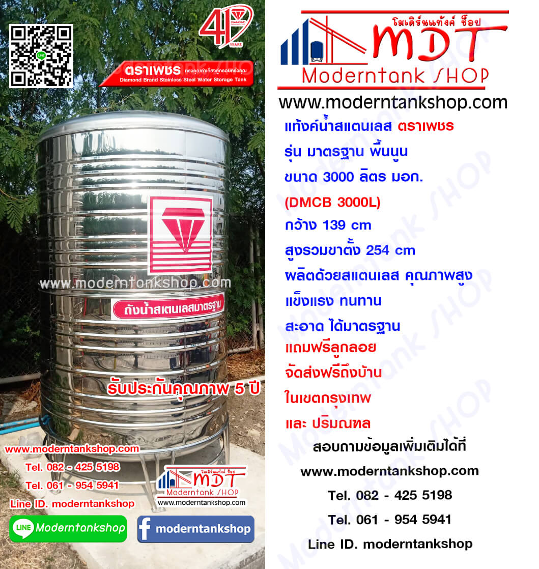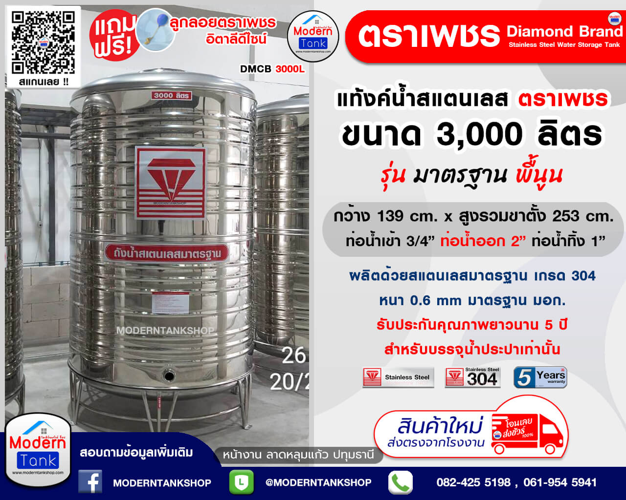 แท้งค์น้ำ สแตนเลส ตราเพชร ขนาด 3000 ลิตร ราคา พิเศษ 24,500 บาท จากปกติ 45,000 บาท รับประกันคุณภาพยาวนาน 5 ปี มาตรฐานใหม่ มอก. 989-2562 ผลิตด้วยสแตนเลสเกรด AISI304 คุณภาพสูง (18-8) ได้รับการรับรองมาตรฐานอุตสาหกรรม (มอก. 989-2562) ความหนาของเนื้้อสแตนเลส 0.6 มม. แข็งแรง ทนทาน สะอาด ปลอดภัยต่อการใช้บรรจุน้ำ ขาตั้งผลิตจากสแตนเลสคุณภาพสูง มีหลายขนาดให้เลือกตามความต้องการ แถมฟรี ลูกลอย PVC ตราเพชร ขนาด 3/4" จัดส่งฟรี ในเขต กรุงเทพฯ นนทบุรี ปทุมธานี สมุทรปราการ พิเศษ !!! สำหรับงานโครงการ สามารถสอบถามส่วนลดเพิ่มเติมได้ครับ พิเศษ !!! บริการยกขึ้นอาคาร (มีค่าใช้จ่ายเพิ่มเติม กรุณาแจ้งล่วงหน้า) ***หากไม่แจ้งล่วงหน้า ทางโรงงานจะขอสงวนสิทธิ์ในการงดให้บริการ นะครับ** ***(เนื่องจากทางโรงงานจะต้องเตรียมอุปการณในการให้บริการครับ)*** ****กรณีขยาย เพิ่ม เปลี่ยน รูน้ำใช้ รูน้ำเข้า ทางโรงงานจะมีค่าใช้จ่ายเพิ่มเติม ตาม ขนาด และ จำนวนที่สั่งทำพิเศษนะครับ**** กรุณาโทร ตรวจสอบสต็อคล่วงหน้า ก่อนใช้งาน 1 - 2 วันครับ *** สนใจสินค้า สอบถามข้อมูลเพิ่มเติมได้ที่ ***