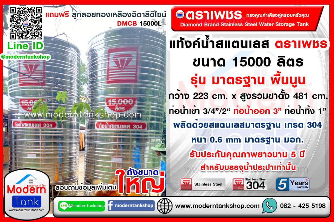 แท้งค์น้ำ สแตนเลส ตราเพชร ขนาด 15000 ลิตร ราคา พิเศษ 125,500 บาท จากปกติ 216,600 บาท รับประกันคุณภาพยาวนาน 5 ปี ผลิตด้วยสแตนเลสเกรด AISI304 คุณภาพสูง (18-8) ได้รับการรับรองมาตรฐานอุตสาหกรรม (มอก. 989-2562) ความหนาของเนื้้อสแตนเลส 0.6 มม. แข็งแรง ทนทาน สะอาด ปลอดภัยต่อการใช้บรรจุน้ำ ขาตั้งผลิตจากสแตนเลสคุณภาพสูง มีหลายขนาดให้เลือกตามความต้องการ แถมฟรี ลูกลอย PVC ตราเพชร ขนาด 3/4" จัดส่งฟรี ในเขต กรุงเทพฯ นนทบุรี ปทุมธานี สมุทรปราการ พิเศษ !!! สำหรับงานโครงการ สามารถสอบถามส่วนลดเพิ่มเติมได้ครับ พิเศษ !!! บริการยกขึ้นอาคาร (มีค่าใช้จ่ายเพิ่มเติม กรุณาแจ้งล่วงหน้า) ***หากไม่แจ้งล่วงหน้า ทางโรงงานจะขอสงวนสิทธิ์ในการงดให้บริการ นะครับ** ***(เนื่องจากทางโรงงานจะต้องเตรียมอุปการณในการให้บริการครับ)*** ****กรณีขยาย เพิ่ม เปลี่ยน รูน้ำใช้ รูน้ำเข้า ทางโรงงานจะมีค่าใช้จ่ายเพิ่มเติม ตาม ขนาด และ จำนวนที่สั่งทำพิเศษนะครับ**** กรุณาโทร ตรวจสอบสต็อคล่วงหน้า ก่อนใช้งาน 1 - 2 วันครับ *** สนใจสินค้า สอบถามข้อมูลเพิ่มเติมได้ที่ ***