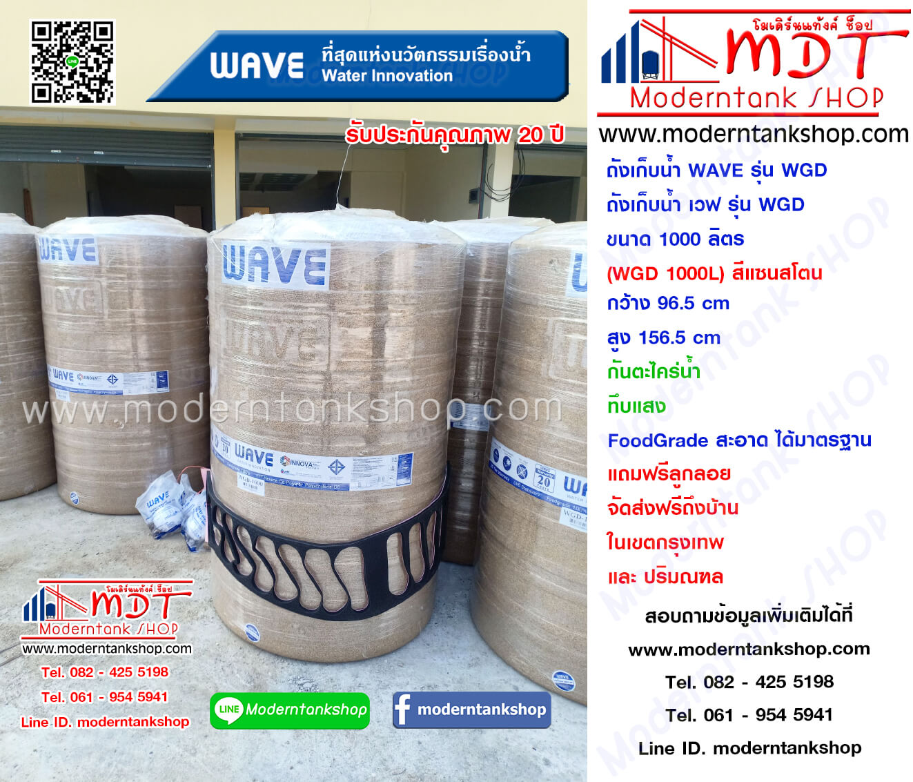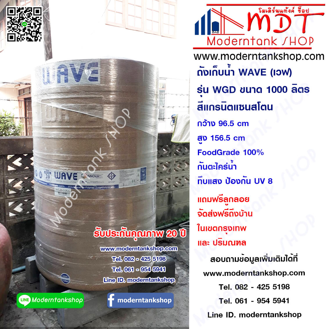 ถังเก็บน้ำ WAVE รุ่น WGD ขนาด 1000 ลิตร รับประกัน 20 ปี ป้องกันตะไคร่น้ำ แถมฟรี ลูกลอยราคาพิเศษ 4,890 บาท จากปกติ 5,190 บาท ถังเก็บน้ำบนดินลายแกรนิต รุ่น WGD/ ป้องกันตะไคร่น้ำ 2. ขนาด (ลิตร) 300 , 500 , 700 , 1000 , 1500 , 2000 , 2500 มีหลากหลายขนาดตามความต้องการ ขนาด 300 ลิตร ราคา 3,290 บาท กว้าง 68.5 cm X สูง 103 cm ท่อเข้า 1" ออก 1" ขนาด 500 ลิตร ราคา 3,990 บาท กว้าง 73.5 cm X สูง 146 cm ท่อเข้า 1" ออก 1" ขนาด 700 ลิตร ราคา 4,590 บาท กว้าง 86 cm X สูง 146 cm ท่อเข้า 1" ออก 1" ขนาด 1000 ลิตร ราคา 5,190 บาท กว้าง 96.5 cm X สูง 156.5 cm ท่อเข้า 1"ออก 1" ขนาด 1500 ลิตร ราคา 6,990 บาท กว้าง 115 cm X สูง 182 cm ท่อเข้า 1" ออก 2" ขนาด 2000 ลิตร ราคา 8,490 บาท กว้าง 116 cm X สูง 215 cm ท่อเข้า 1" ออก 2" ขนาด 2500 ลิตร ราคา 10,590 บาท กว้าง 152 cm X สูง 167 cm ท่อเข้า 1" ออก 2" พิเศษ !!! โทรหาเรา รับสินค้าราคา Promotion ทันที 082 - 425 5198 ,061 - 954 5941 พิเศษ !!! โทรหาเรา รับสินค้าราคา Promotion ทันที 082 - 425 5198 ,061 - 954 5941