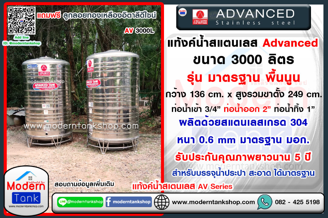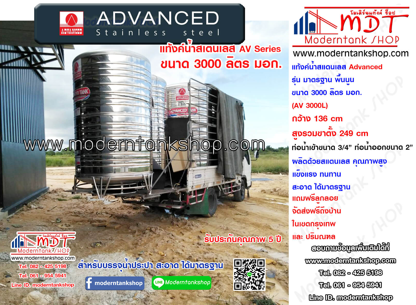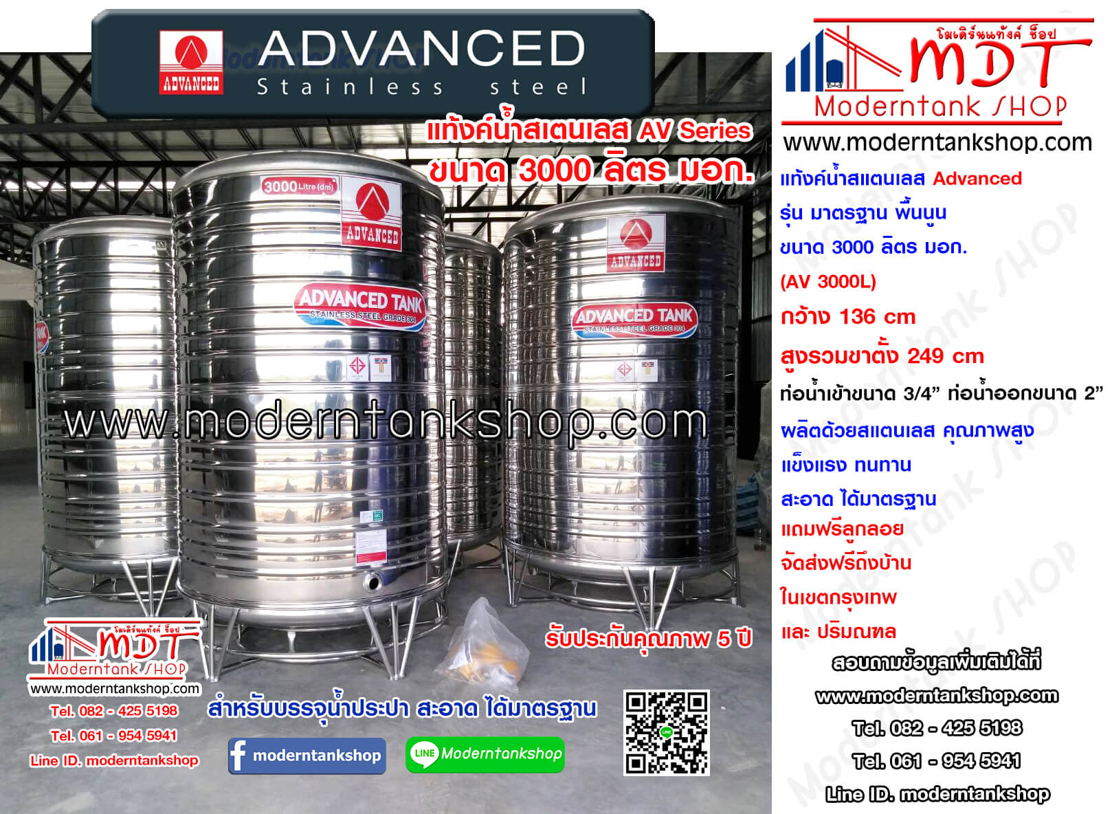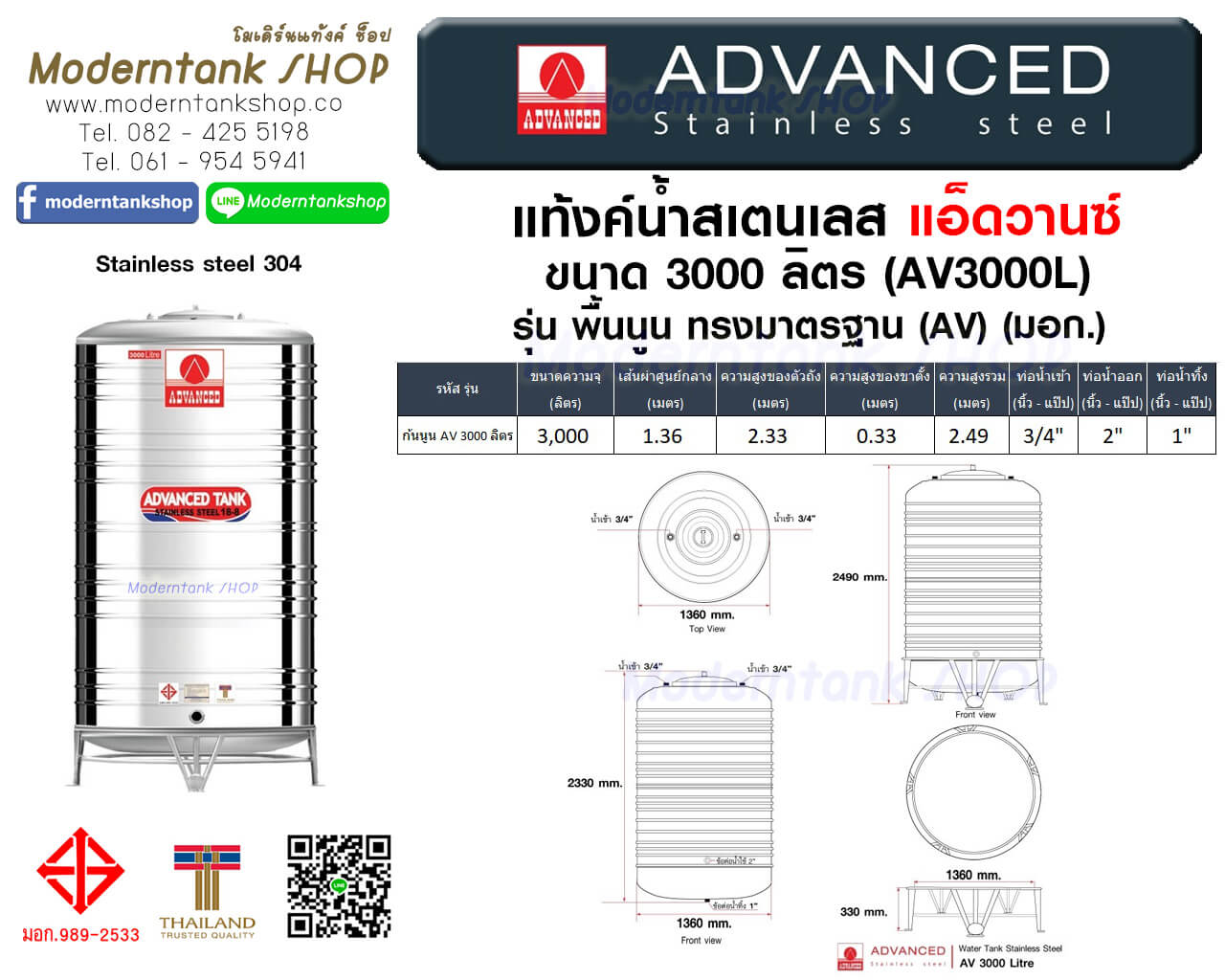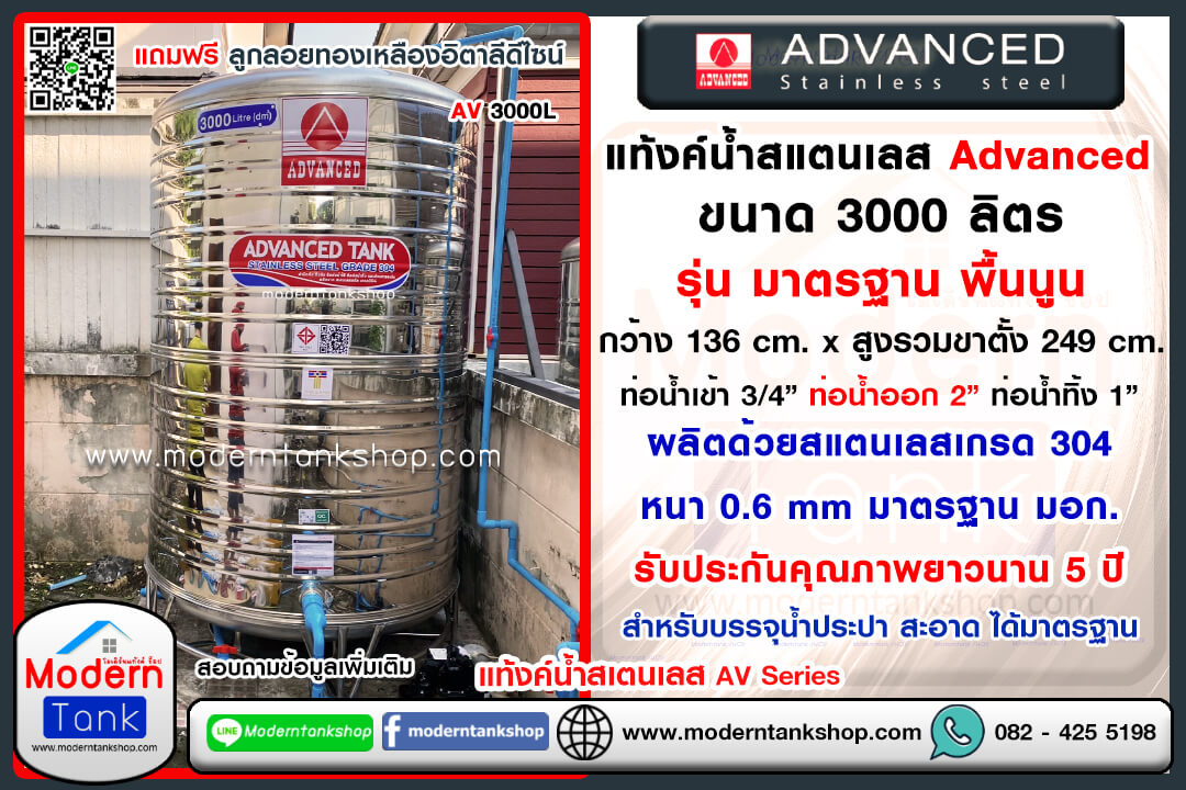 แท้งค์น้ำสเตนเลส ตรา Advanced ขนาด 3000 ลิตร รุ่น (AV) มอก.