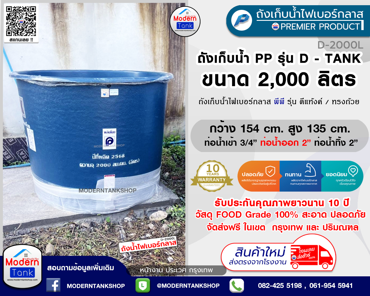 ถังเก็บน้ำไฟเบอร์กลาส พีพี. รุ่น D-TANK ทรงถ้วย ขนาด 2000 ลิตร