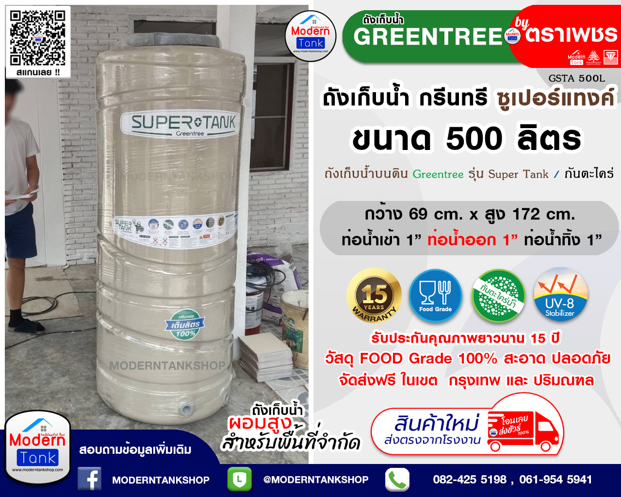 ถังเก็บน้ำบนดิน ตราเพชร Super Tank รับประกัน 15 ปี รุ่น ซูเปอร์แท้งค์ GSTA ขนาด 500 ลิตร ป้องกันตระไคร่น้ำ ราคาพิเศษ 2,500 บาท จากราคาปกติ 4,700 บาท กว้าง 69 x สูง 172 cm. ท่อเข้า 1" ท่อออก 1" แถมฟรี ลูกลอย PVC ตราเพชร ถังเก็บน้ำบนดิน ตราเพชร รุ่น Super Tank ผลิตด้วยวัสดุ Food Grade สามารถสัมผัสอาหารและน้ำดื่มได้ ตามมาตรฐานองค์การอาหารและยาสหรัฐอเมริกา (US FDA) วัสดุมีคุณสมบัติพิเศษ มีความทึบแสง ป้องกันการเกิดตะไคร่น้ำ ปราศจากกลิ่นและการปนเปื้นของเชื้อโรคและเชื้อแบคทีเรีย จึงปลอดภัยต่อสุขภาพของทุกคนในบ้าน มีส่วนผสมของสาร UV ปกป้องเนื้อพลาสติก ให้อายุการใช้งานของถังยาวนานทนทานขึ้นแม้ต้องวางอยู่กลางแดด ออกแบบส่วนต่อระบบท่อให้ง่ายต่อการติดตั้ง ท่อน้ำเชื่อมต่อด้วยระบบ Spin Welding แน่นสนิดไม่รั่วซึม