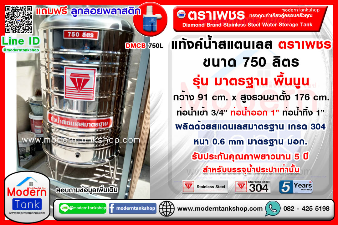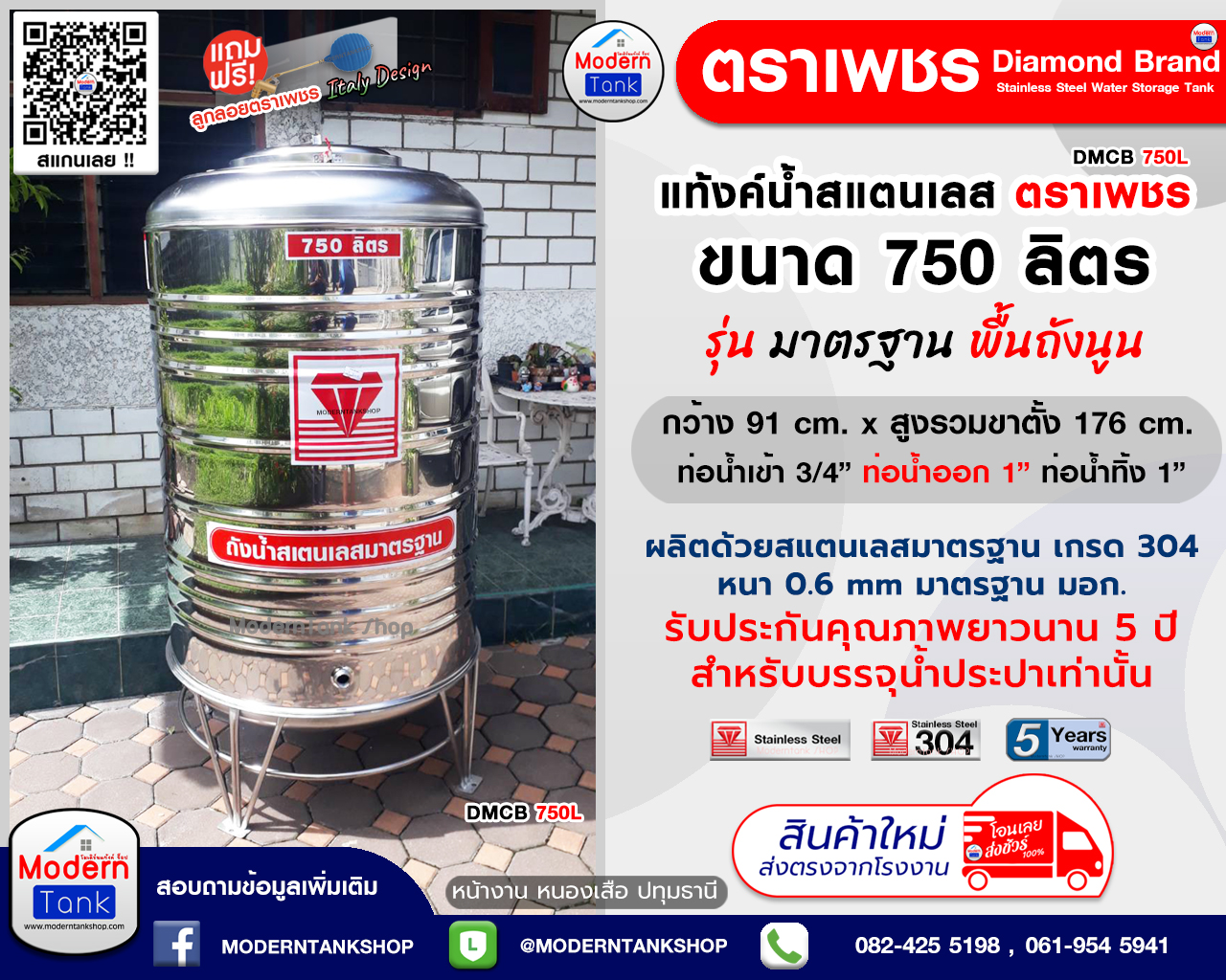 แท้งค์น้ำ สแตนเลส ตราเพชร ขนาด 750 ลิตร